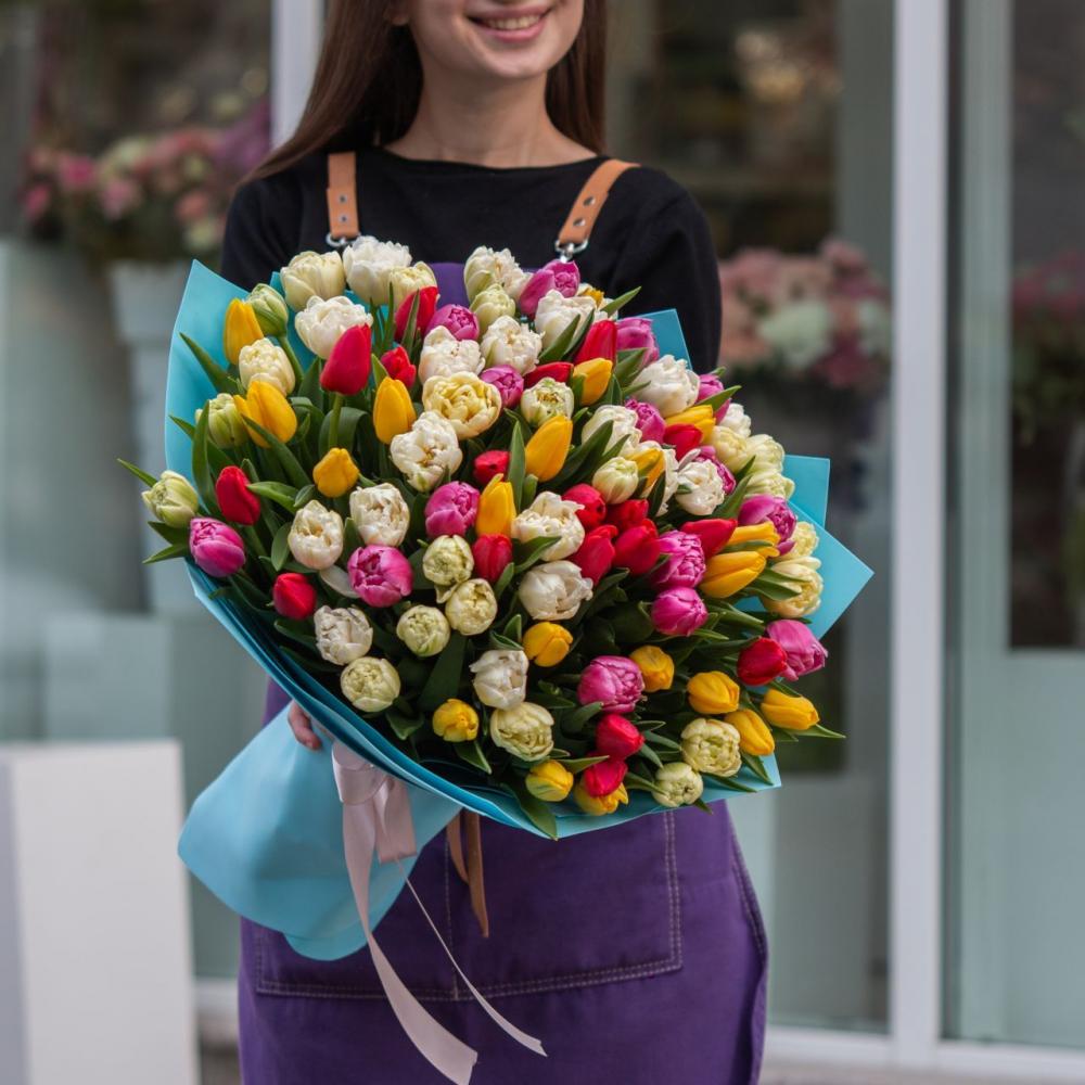 Букет собран из 101 тюльпана и упакован в мешковину с любовью от нашего флориста . Вы всегда можете купить такой букет с доставкой в нашем онлайн магазине цветов и подарков находящийся в г.Нальчике. Опытные флористы сформируют ваш букет из свежих цветов, и курьер в течении часа доставит Ваш букет по адресу лично в руки получателю, получив в ответ благодарную улыбку. высота 50см ширина 45