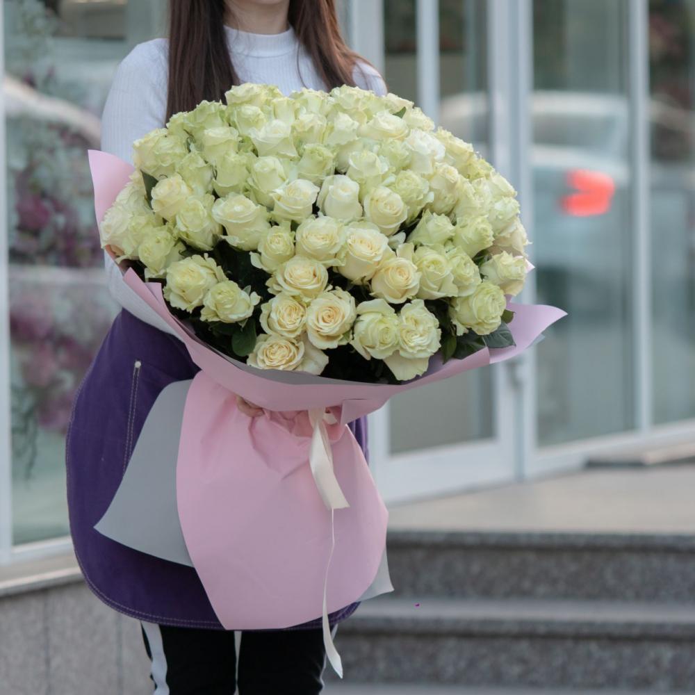 Букет из белоснежных роз, красиво упакованный в крафт бумагу . Вы всегда можете купить такой букет с доставкой в нашем онлайн магазине цветов и подарков находящийся в г.Нальчике. Опытные флористы сформируют ваш букет из свежих цветов, и курьер в течении часа доставит Ваш букет по адресу лично в руки получателю, получив в ответ благодарную улыбку высота 60см ширина 65