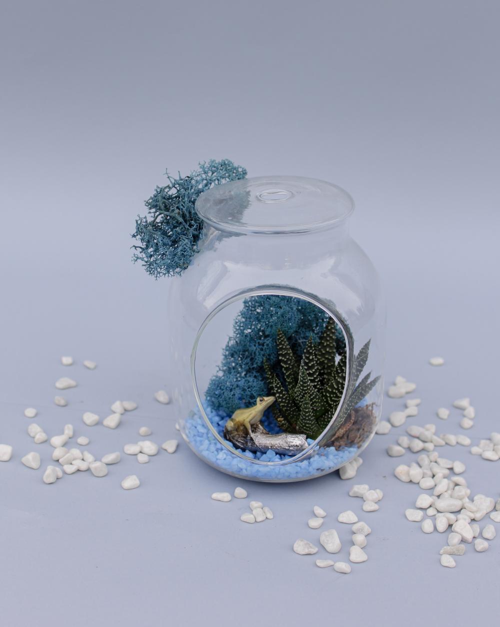 Флорариум "небесная мгла" с цветной галькой, эхиверией, стабилизированным мохом, эхиверия и декоративной лягушкой в красивом стеклянном боксе