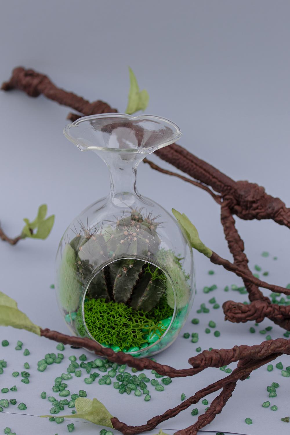 Флорариум "Зеленый кит" с зеленой галькой, стабилизированным мохом, сухоцветами и кактусом для ценителей природной красоты