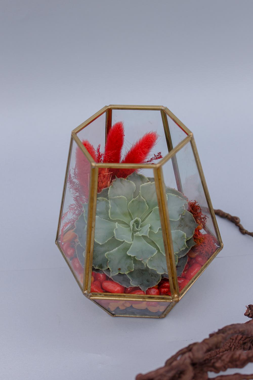 Флорариум "Золотая клетка" с цветной галькой, стабилизированным мохом, сухоцветами и эхиверией для ценителей природной красоты
